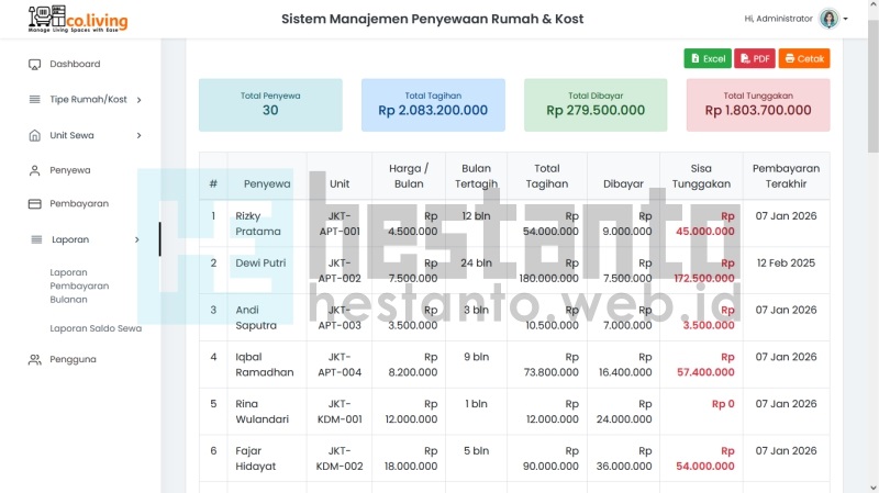 - Laporan Saldo Sewa Menampilkan status saldo atau tunggakan penyewa.