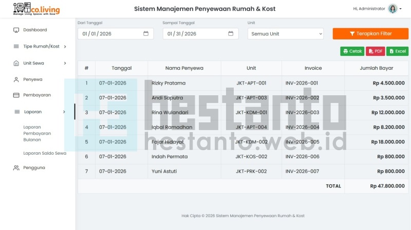 - Laporan Pembayaran Bulanan Menyajikan ringkasan pembayaran sewa per bulan.