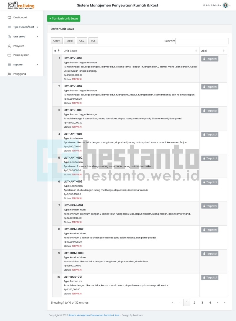 - Terkunci (Terpakai) – Unit yang sedang disewa tidak dapat diedit atau dihapus demi menjaga integritas data