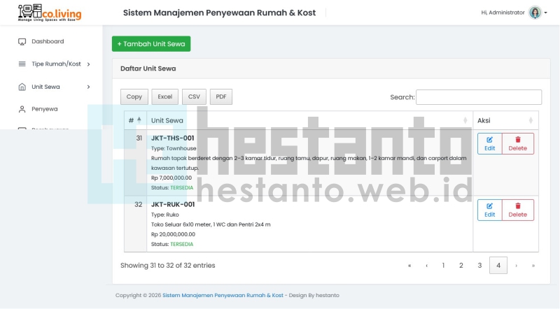 Menu Unit Sewa digunakan untuk mengelola seluruh data unit rumah, kost, apartemen, maupun properti lain yang disewakan. Pada menu ini, administrator dapat menambahkan, melihat, mengubah, dan menghapus data unit sewa secara terpusat dan terstruktur.