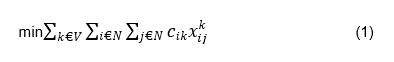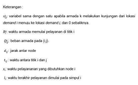 Perumusan matematika buat kasus VRPTW yang bertujuan meminimalkan total waktu tempuh ataupun bayaran ekspedisi dengan beberapa pelanggan merupakan selaku berikut:
